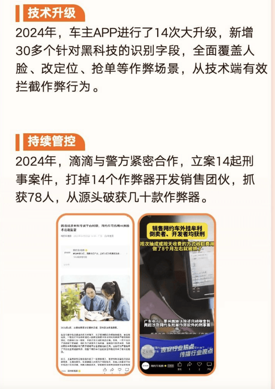 同时滴滴还展现,从2024年开始,滴滴车主APP已经妨碍了14次大降级,新增了30多个针对于外挂黑科技的识别字段,周全拆穿困绕了搜罗人脸 、刊定位 、购买抢单等做弊场景 ,从技术端实用拦阻做弊行动 。